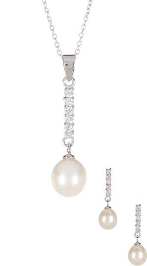 - - Rhodium plated pave CZ bar and dangling pearl pendant necklace - Spring ring clasp - Approx. 17" length - Approx. 1.25" pendant - Approx. 8-9mm pearl - Imported Earrings: - Rhodium plated pave CZ bar and dangling pearl earrings - Post back - Approx. 1" length - Approx. 8-9mm pearls - Imported Please note: Due to the unique and natural origin of pearls, slight variations in overtone and quality may occur. These characteristics enhance the beauty of the product and truly make them a one of a kind piece.