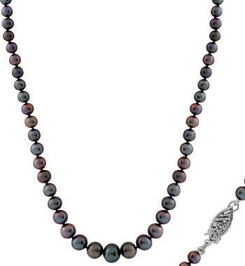 A lustrous sterling silver necklace composed of graduated black freshwater pearls offers elegant style.