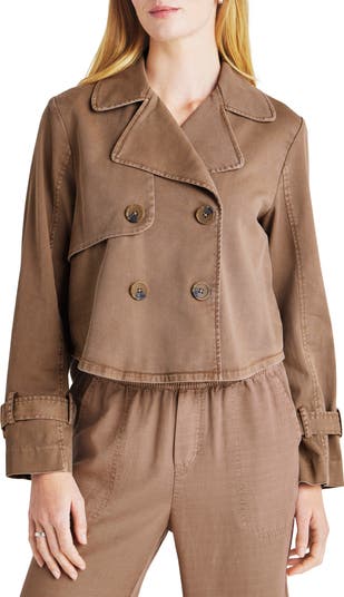This polished short jacket is designed in a double-breasted silhouette with oversized lapels.
