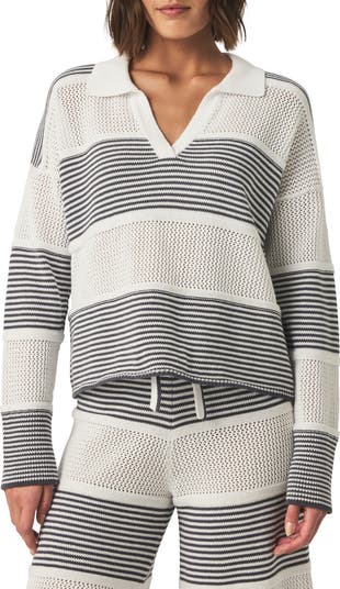 An open johnny collar and dropped shoulders further the relaxed vibes of this cotton sweater knit with a mix of stitches that highlight the colorblock stripes.