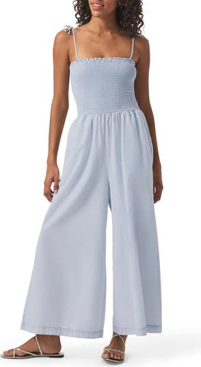 Get to the fun faster in a one-and-done jumpsuit served with a sweetly smocked bodice and widened, flowy legs.