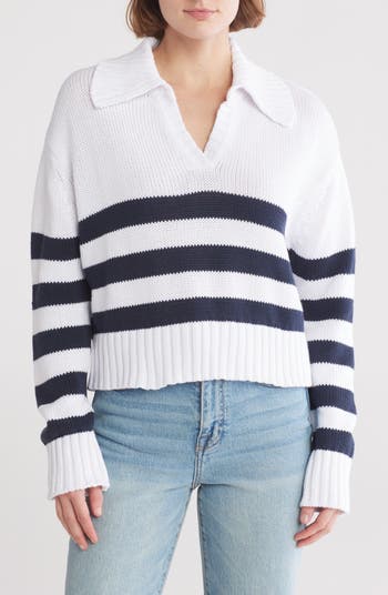 Chunky stripes ring the front of this chic polo sweater knit from cozy all-cotton.