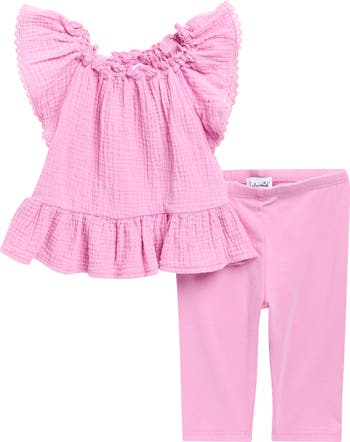 Slip baby into the fresh, lightweight comfort of cotton gauze in this adorable set featuring a ruffle lace-trimmed top and coordinating leggings.