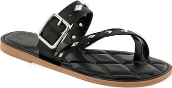 Gleaming diamond studs punctuate V-shaped straps and a buckle strap on this slide sandal set on a quilted footbed.