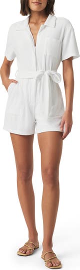 Plush terry brings amazing softness and texture to this summery romper detailed with handy pockets and a matching sash tie at the waist.