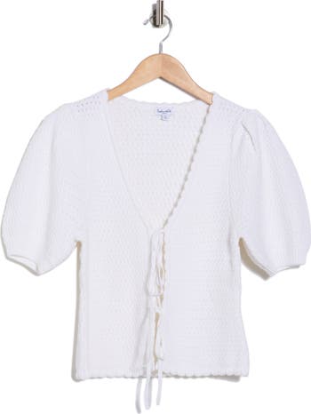 This puff-sleeve sweater with a tied front bring a romantic layer to your everyday looks.
