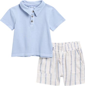Baby will be ready for beach days or warm-weather events in this soft cotton set featuring a solid polo paired with striped shorts.
