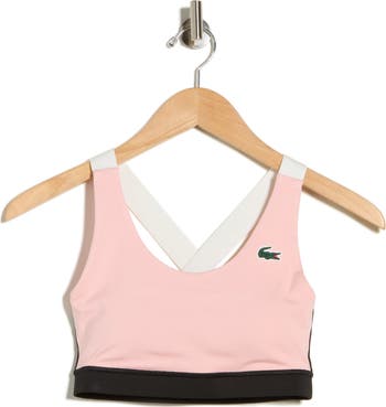 A signature crocodile signs off this two-tone sports bra designed with medium support and removable soft cups.