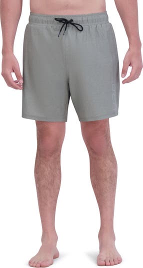 Quick-drying fabric enhanced with a four-way stretch liner keeps you moving comfortably in and out of the water in volley-length swim trunks designed with UPF sun-protective properties.