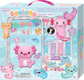 - Includes squishy, 3D squishy journal, a sheet of stickers, four paper clips, three highlighters and 10-color pen