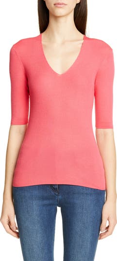 Fine ribbing creates a slimming effect in a fitted V-neck sweater knit from Italian wool and silk yarns.