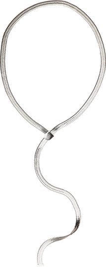 An '80s-inspired herringbone chain slinks around your neck in this shiny lariat necklace fixed with a slide closure to adjust the drop length.
