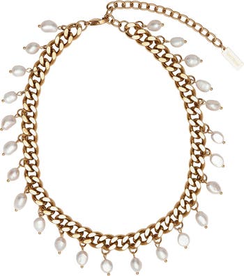 Baroque freshwater-pearl charms add elegant counterpoint to the chunky curb links of this striking necklace plated in 18-karat gold.