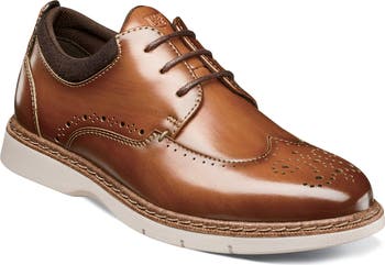 A patent finish lends shine to a classic wingtip shoe crafted from faux leather.