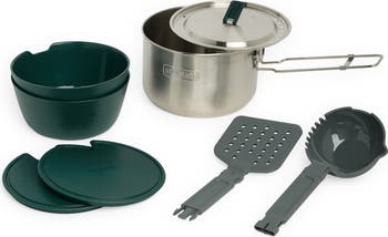 Pack smart for your camping trip with a cook set featuring a mini stainless-steel pot, a lid and two bowls and utensils that conveniently nest when not in use.