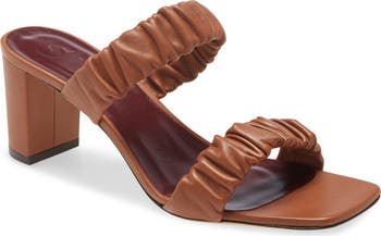 Scrunched straps texture the top of a breezy, heeled slide destined to add a statement-making accent to your lunch with friends or a night out on the town.
