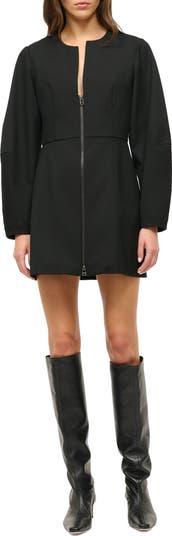 A long-sleeve minidress cut from structured twill offers a sassy night-out look with a deeply dipped neck and two-way-zip closure.