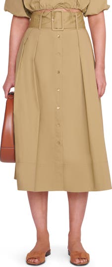 A belted high waist and defining pleats lend an on-trend utilitarian look to this A-line cotton-poplin skirt.