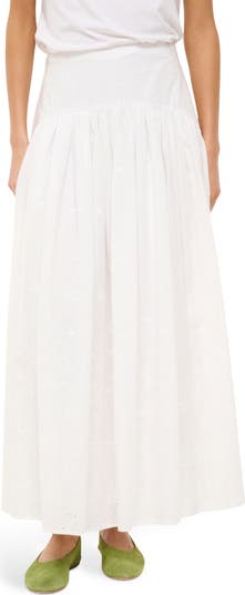 Delicate gathers enhance the drop-waist design of this sweeping maxi skirt made from airy cotton embroidered with floral eyelets.
