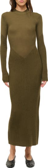 Engineered rib stitching enhances the figure-skimming fit of a long-sleeve sweater-dress knit from soft wool-blend yarns.