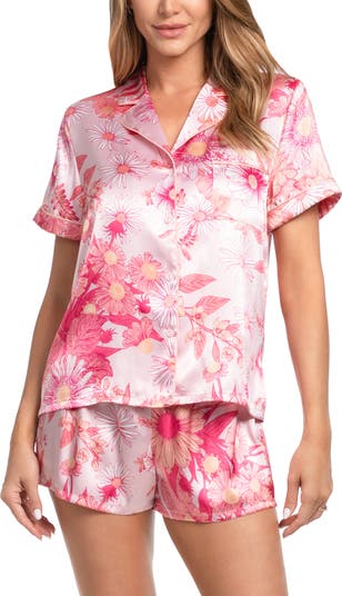 A flourish of blooms enlivens this soft and satiny pajama set that pairs a notched-collar button-up top with matching shorts.