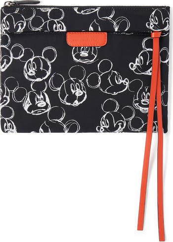 A leather logo tab brings brand recognition to this durable pouch detailed with playful sketches of Mickey Mouse.