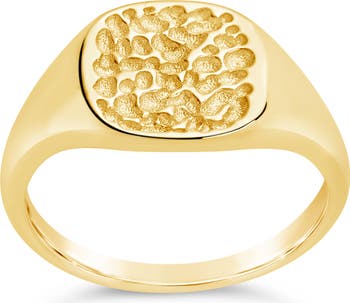 A 14-karat gold plated square signet ring showcases a textural, hammered face for contemporary style.