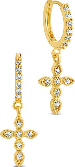 Dainty cubic zirconia stones shimmer over cut-textured hoop and cross drop earrings in a fine 14-karat gold-plate finish.