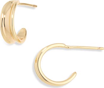 A concave silhouette catches the light on dainty hoop earrings boasting a high-shine finish.