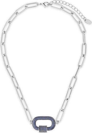 Pavé CZ dazzles on a bold carabiner pendant suspended from a contemporary paper-clip chain necklace plated in polished rhodium.