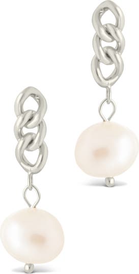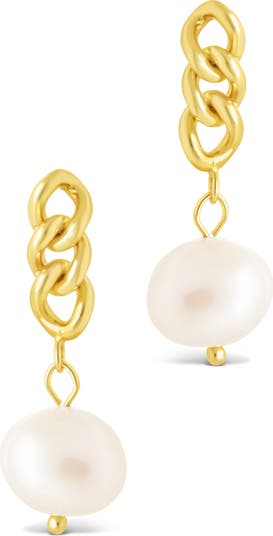 Lustrous faux pearls dangle from these crisscross-link drop earrings dipped in a glossy 14k gold or silver finish.