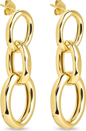 A trio of interlocking links forms statement drop earrings, gleaming in polished 14-karat gold plate.