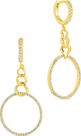 Sparkling cubic zirconia hoops linked by a trio of curb chains create bold statement drop earrings.