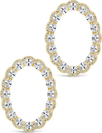 Variegated cubic zirconia draw the eye to front-facing hoops finished in warm 14-karat-gold plating.