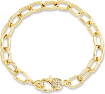 Shimmering cubic-zirconia stones cluster against the clasp securing a chain bracelet modernized by paper-clip links.