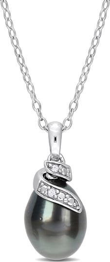 Wrapped diamonds accent the top of a slender black Tahitian cultured freshwater pearl pendant in this stunning sterling silver necklace.