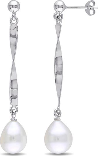 Polished sterling silver earrings suspend twisted drops with cultured freshwater pearls for elegant style.