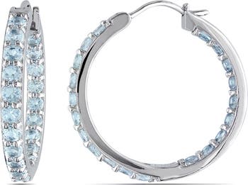 Round-cut aquamarine stones bring sparkle to the inside and outside of these classic hoop earrings