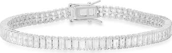 A timelessly elegant tennis bracelet is fashioned from a single, flexible row of dazzling cubic zirconia baguettes.