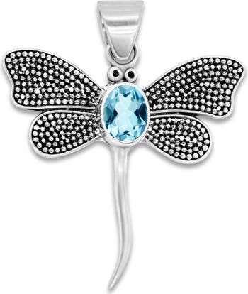 A bezel-set oval blue topaz sparkles from this polished sterling-silver dragonfly pendant textured in milgrain dots for elegant shine.