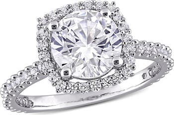 A polished sterling silver ring showcases a prong-set round lab-created white sapphire framed by a dazzling halo and embellished band for luminous sparkle.