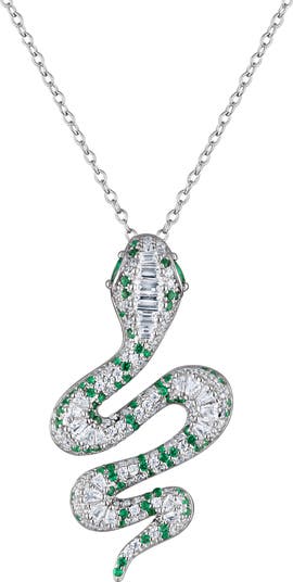 Channel your inner serpent with this sterling silver necklace featuring a snake pendant ablaze with cubic zirconia and emerald-hued accents.