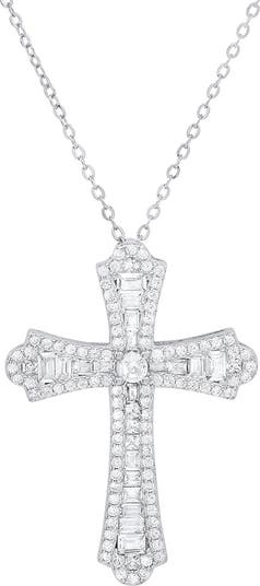 Cubic-zirconia crystals further the shine of a polished chain necklace that displays a cross-shaped pendant.