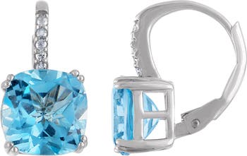 Dainty round-cut diamonds highlight the posts of these lever-back earrings centered with a stunning blue topaz.