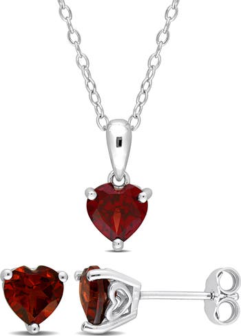 Show off sweet sparkle with this garnet heart stud earrings and necklace set crafted from polished sterling silver.