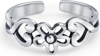 Sterling silver adds a fine finish to a heart and flower detailed toe ring, ready for warm-weather styling.