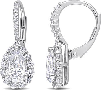 Pear-cut and round lab-grown moissanite sparkle from elegant lever-back earrings crafted from polished sterling silver.