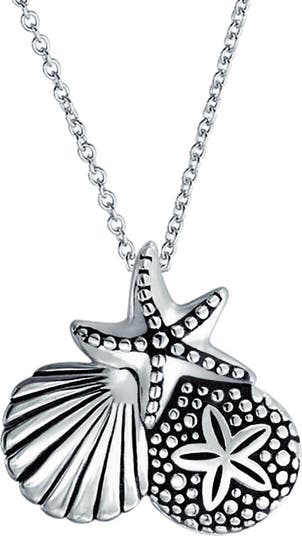 A sand dollar, starfish and clam trio charms a sterling silver necklace for beach-ready appeal.