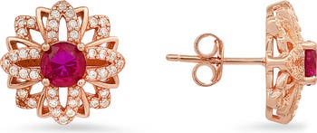 A colorful center stone adds an eye-catching pop to stud earrings surrounded by cubic zirconia.