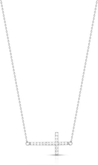 A sideway cross sparkles with cubic zirconia on this chain necklace made of sterling silver plated in rhodium.